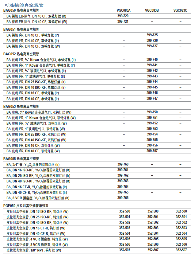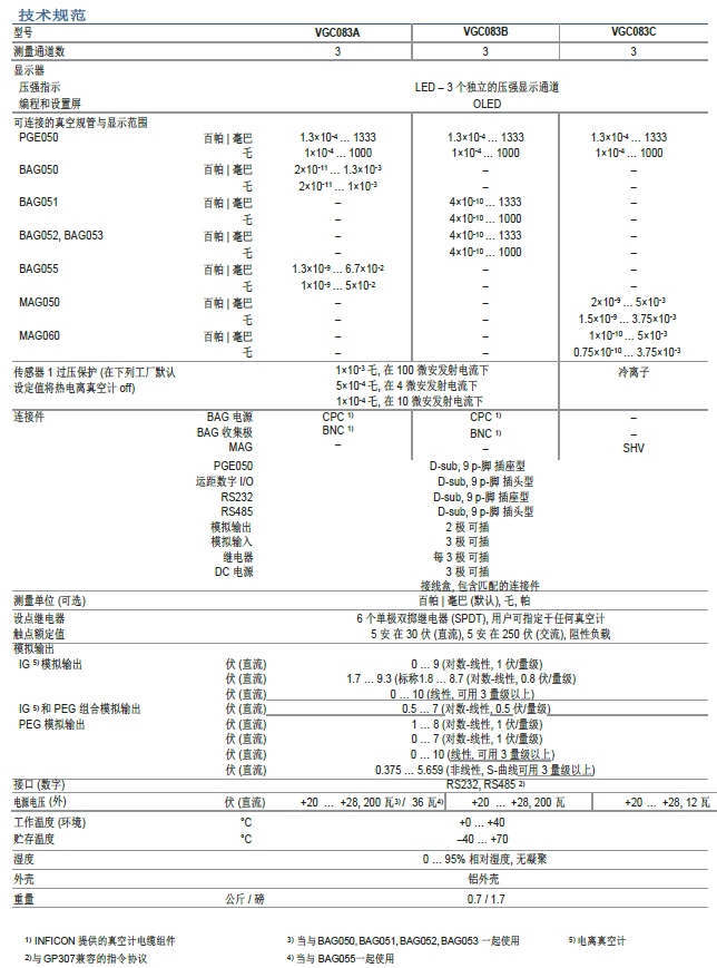 INFICON 真空計(jì)控制器 VGC083 設(shè)計(jì)于與被動(dòng)型真空規(guī)管 BAG05x 或 MAG0x0 和 PGE050 在固定的組合下: 兩個(gè) PGE050 真空規(guī)管和一個(gè) BAG05x 或 MAG0x0 真空規(guī)管一起使用. 用 BAG 和 PGE 真空規(guī)管, VGC083 控制與監(jiān)測真空壓強(qiáng)從大氣壓( ATM) 低至 2.7×10-11 百帕 | 毫巴. 六 (6) 個(gè)被指定于任何真空規(guī)管的單極繼電器與 RS232 和 RS485 接口有助于系統(tǒng)的集成. 具有堅(jiān)固工業(yè)結(jié)構(gòu)的 VGC083 與被動(dòng)型真空規(guī)管的組合為要求寬的真空測量范圍的真空應(yīng)用提供既可靠又經(jīng)濟(jì)的測量.