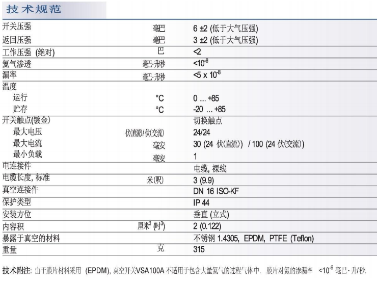 NFICON 真空開關(guān) VSA100A 作為安全開關(guān)廣泛應用于真空系統(tǒng)中。例如,在使用壓力低于大氣壓 6 mbar 的吹掃氣體對真空系統(tǒng)排氣時,該壓力開關(guān)可自動中斷氣體供應。當差壓為 6 mbar 且返回切換壓力比大氣壓低 3 mbar 時,彈性膜片將激活轉(zhuǎn)換接點,而該接點又可用來直接切換任何輔助設備。